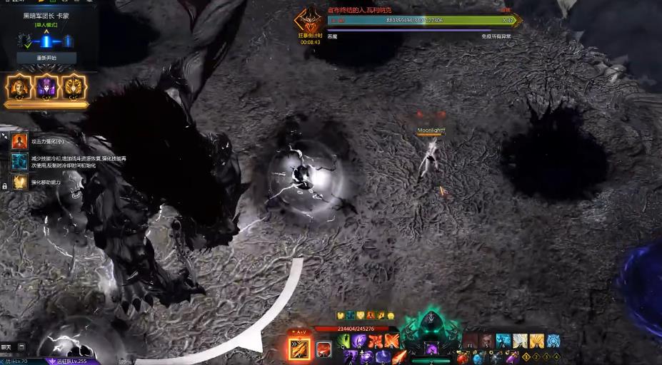 军团长会抬头向前方发出扇形闪电,整个区域会持续触发眩晕,还会抬头打出长条形击飞。前六次攻击结束后必定会出现第七种,前置动作是它会双手护住头部,然后奋力张开翅膀将两侧玩家给击飞。阿贾娜会触发远古极冰之矛将其冻住,此时使用暗黑雷与爆发药造成伤害,等boss起身飞走后便会进入到第二段跑酷。第二段路程很短,过程中如果跑的比较快,不需要反制它,跑得慢的玩家可以等其冲走再过去。也可以用空格键硬顶过去,远处boss本体就会对我们射出激光,注意躲避地面上的长条。