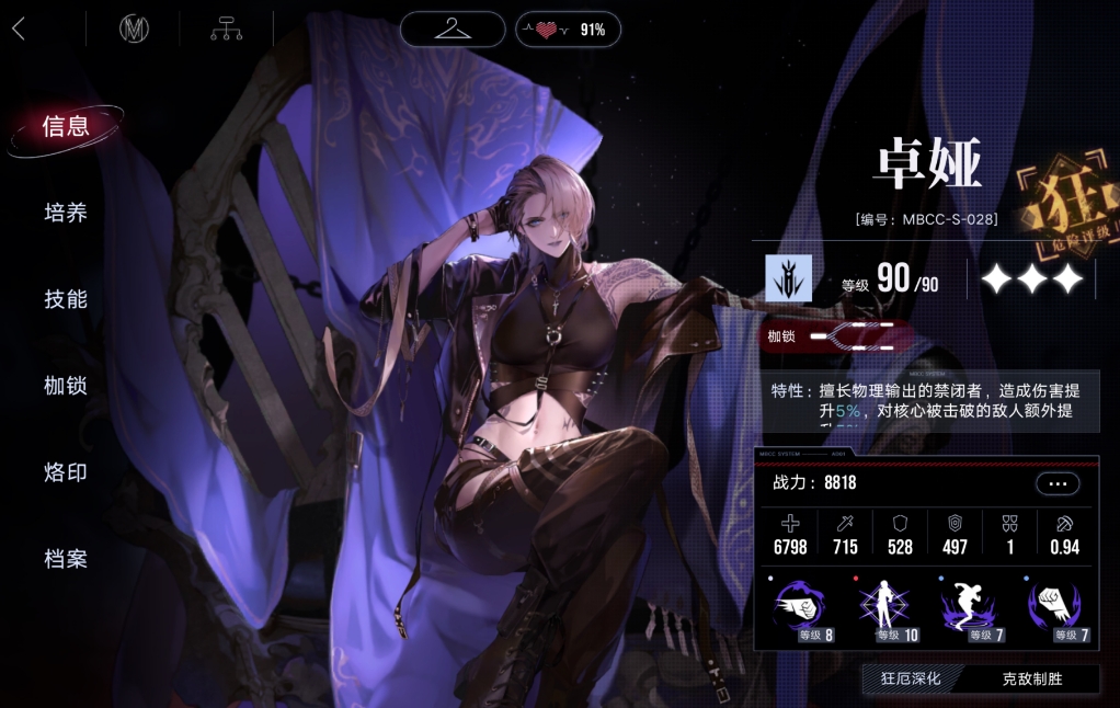 卓娅的专烙效果是在军团降临持续时间内自身能额外获得百分之三十的减伤,同时免疫所有负面状态,专烙使用的场合较少,金印记又比较稀缺没必要开专烙。卓娅的烙印选择为输出向,初始虽然有很多玩家拿卓娅带铁壁当盾去打,现在混沌之拥是卓娅常用的选择,破核后增伤对于她的提升相当可观,配合走A能打出很高伤害,其次是各类充能套,以狂欲为核心一号位选调律或者高塔,三号位选回廊或者先行者,新手烙印不齐全的情况下也能选新城套。