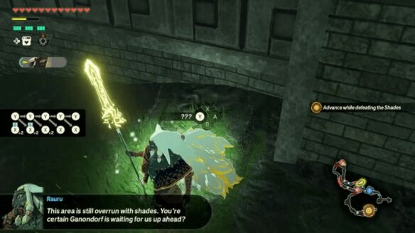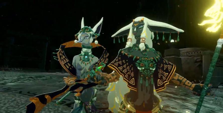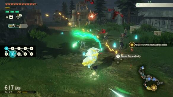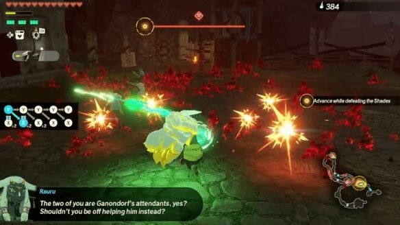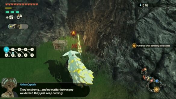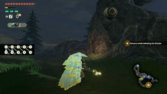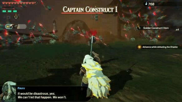 清理完据点内的敌人后,前往东边的开阔地,与一名岩石巨人和另一名格鲁德刺客战斗。切记使用破盾攻击(如劳鲁的「崇高冲击」或「定时炸弹」)来快速瓦解岩石巨人的防御。击败两者后,向北前往海拉鲁城堡触发过场动画。