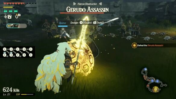 在最后的据点,你将与一名格鲁德刺客进行首领战。由于她的攻击为极短程的近战,触发完美闪避的难度较高。更有效的策略是使用格挡(ZL键)来防御她的攻击,从而更稳定地暴露其弱点条。