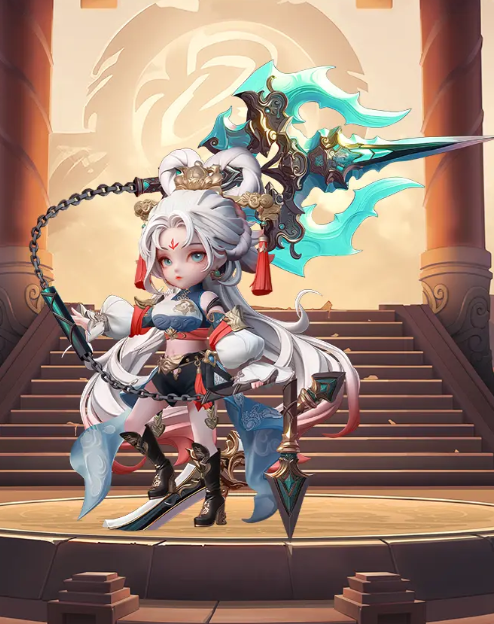升到1星会在用技能使敌人生命值低于50%时,对另外一个生命值最高的目标打出240%伤害,升3星会在每次普攻或技能打出暴击时,无视目标40%防御并将本次伤害的100%分摊给相邻敌人,他的合击技是在和杨戬一起上场时会提升属性值。