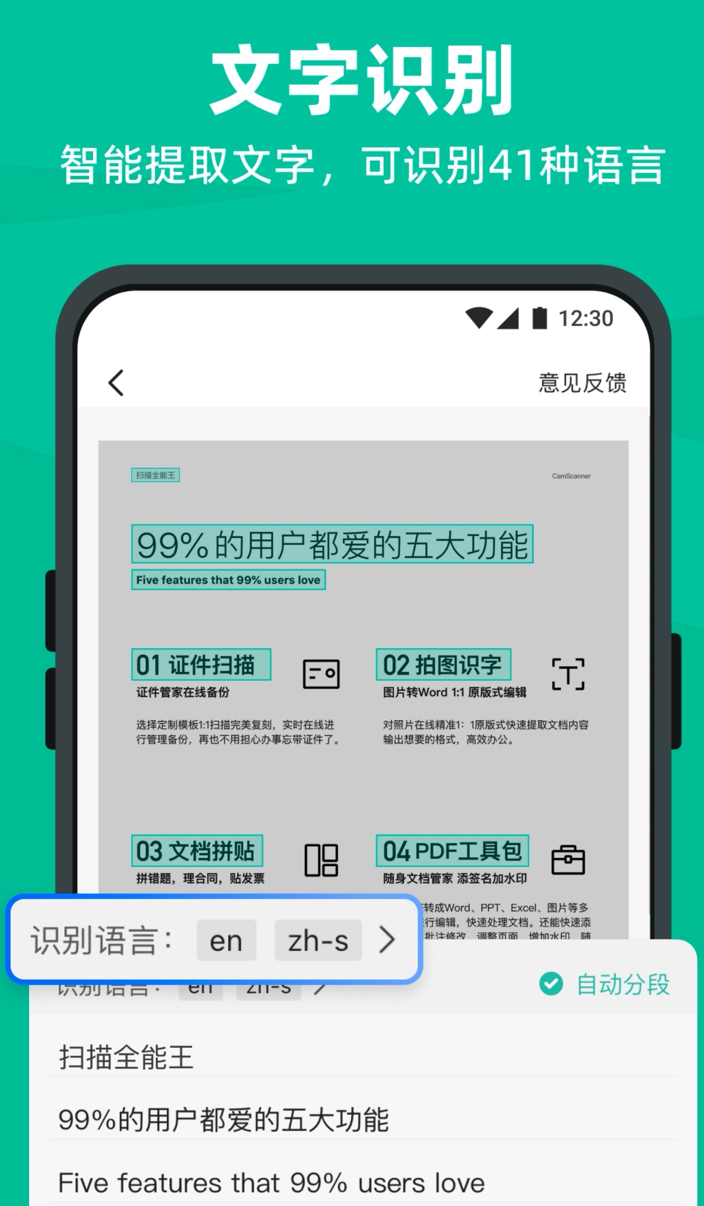 在手机上安装好这个软件后,就能将手机摄像头变成智能扫描仪,应用使用的智能高清滤镜技术,能将被扫描文档变清晰,此外,本产品 中还引入了OCR文字识别、云端同步以及为法律、商务场景设计的水印相机等专业功能。