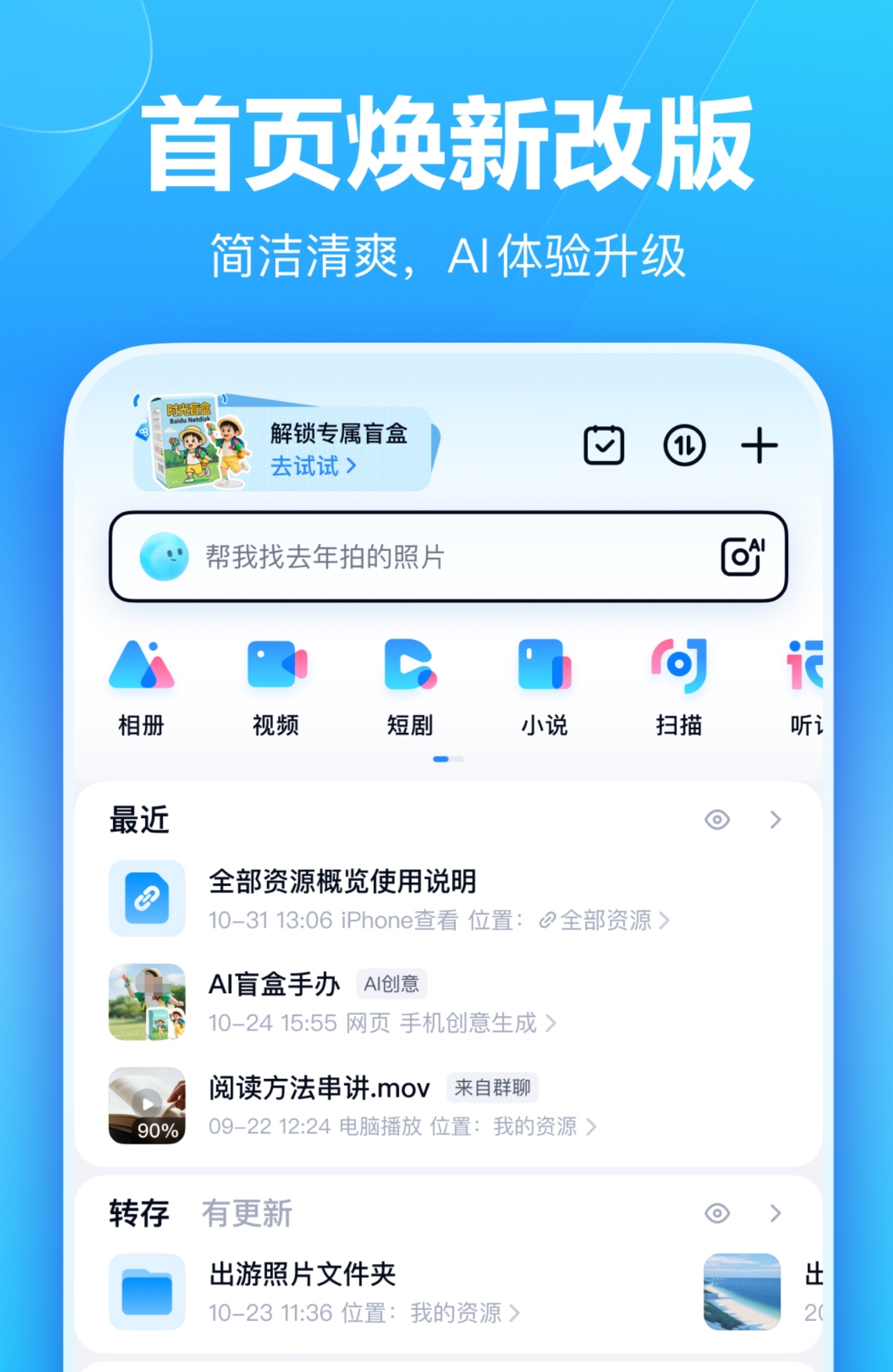 百度网盘最大的特色,就是拥有覆盖了生活、学习、工作全场景的AI服务,比如其中的ai相机,能实现从拍摄、处理到云存储的一站式服务,而ai笔记和简单听记两个功能,则可以自动为学习资料和会议录音生成结构化笔记与纪要。