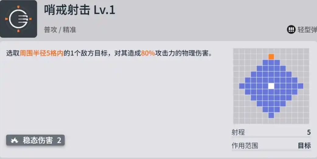 后者用于释放三技能,每三点能释放一次,如果没有武器和固键支持这是她唯一能获取导染的方式。乌尔丽德的普攻也是唯一的主动远程攻击手段,实战中遇到不适合近身的敌人,比如说要打自爆怪时用近战技能肯定会被炸飞,此时可以使用普攻进行输出。主动技能猎手视线是她的主要输出来源,该技能造成的伤害分为三段,第一段是近战精准伤害,可以触发某些角色的支援攻击,结束攻击后有四格移动追加,可以在进攻时挑选有利的输出角度,输出结束后方便快速撤离到安全区域。