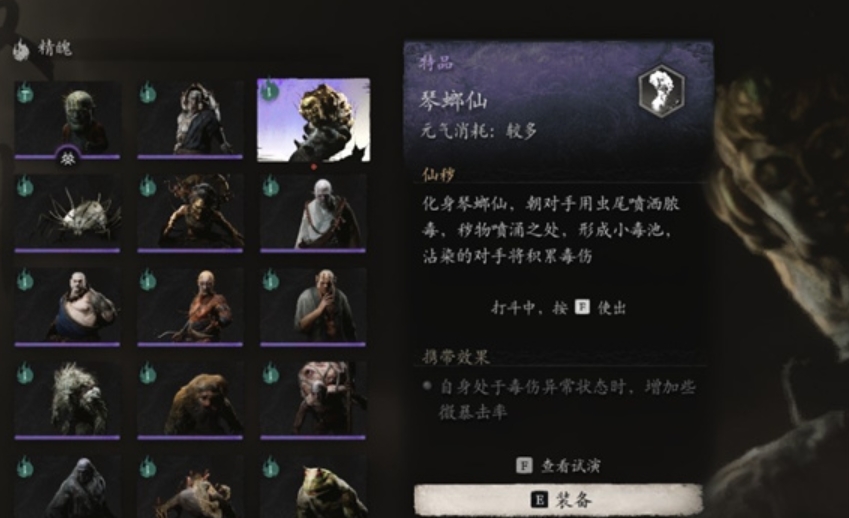 琴螂仙跟燧先锋一样攒满元气需要打击次数为一百一十次到一百三十七次之间,装备该精魄后会变成琴螂仙在地上蠕动五次,随着每次蠕动头部和尾部也跟着甩,两头都能产生碰撞伤害,同时从尾巴向周围发射出一堆毒液并形成毒池。每次喷吐毒液分布的毒池区域有一定随机性,毒池能在场上停留一分钟的时间,踩到毒池的敌人会持续积累中毒量,累积满后进入中毒状态并持续扣血。