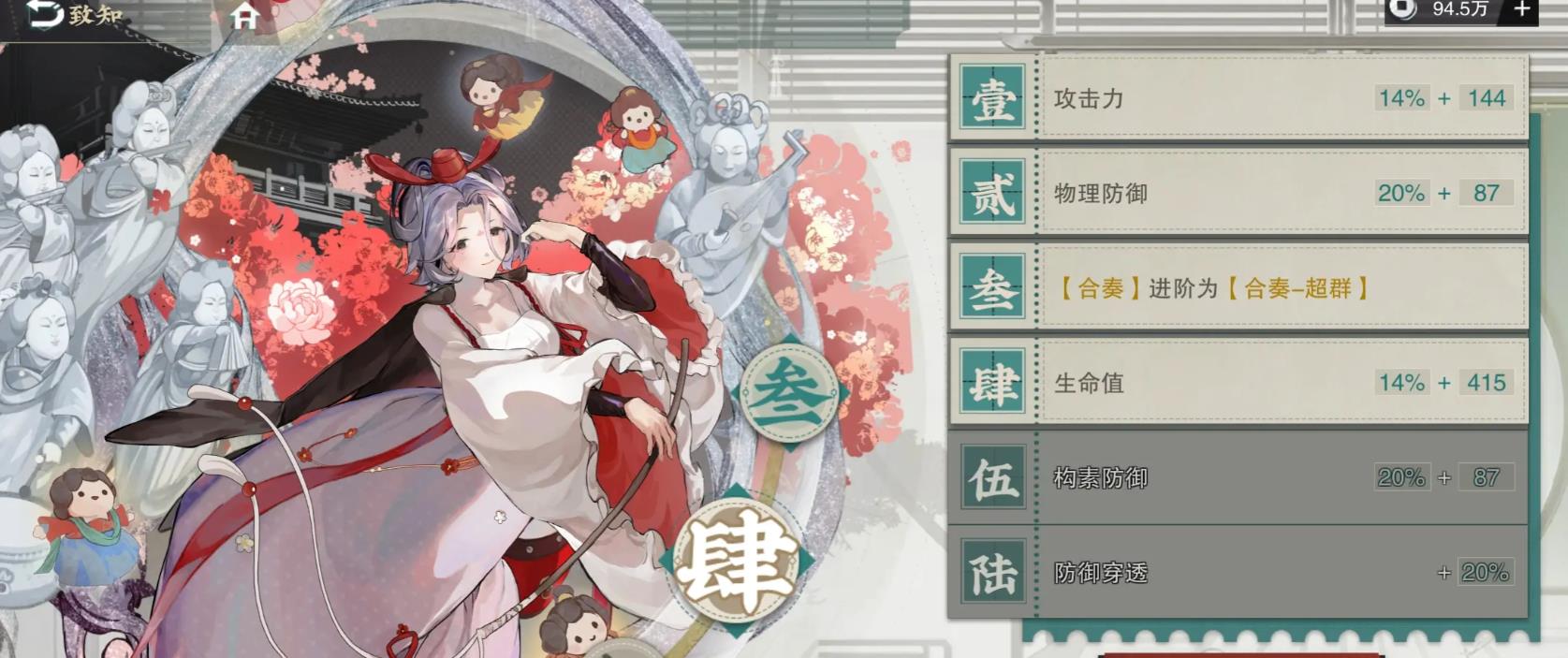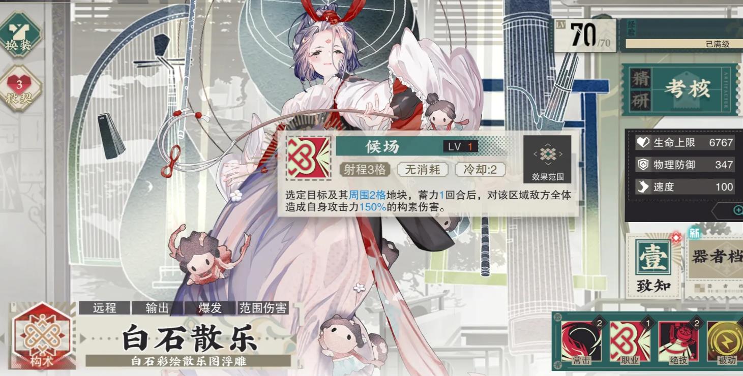 这样便能让职业技拥有高达百分之八十的命中率,并不需要担心白石散乐的生存,特别是在有洛神赋图作为队友的时候。被动一排练是蓄力期间受到伤害降低,让其有不输给宿卫类职业的较强生存能力,每次被攻击都会让速度增加,不过增加速度不会在本回合体现。主要是第二回合开始时候角色行动顺序的排序,会让白石散乐比原来前面怪物更快行动。