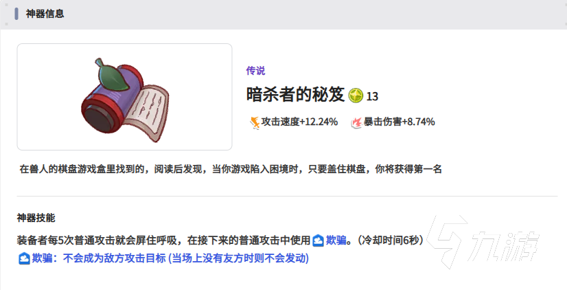 暗杀者的秘籍也很不错,也有一定的攻速提升效果,不过在暴击伤害这方面有一定的加成,所以装配的装备在攻击的时候,如果次数达到5次,那么会拥有一次欺骗效果施加给敌人。