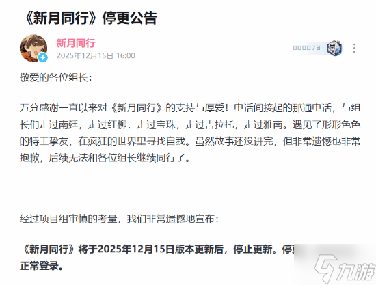 《新月同行》团队在公告的最后表达了对所有玩家的感谢:“能与各位组长同行,深感荣幸,这段旅程的温暖与遗憾,我们会铭记于心。”
