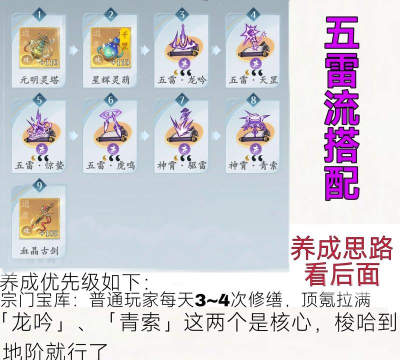思路解析:这套是初阶法宝的通用组合,双定海神针让输出能力更上一层楼,辅助法宝针对不同的职业可以进行调配!