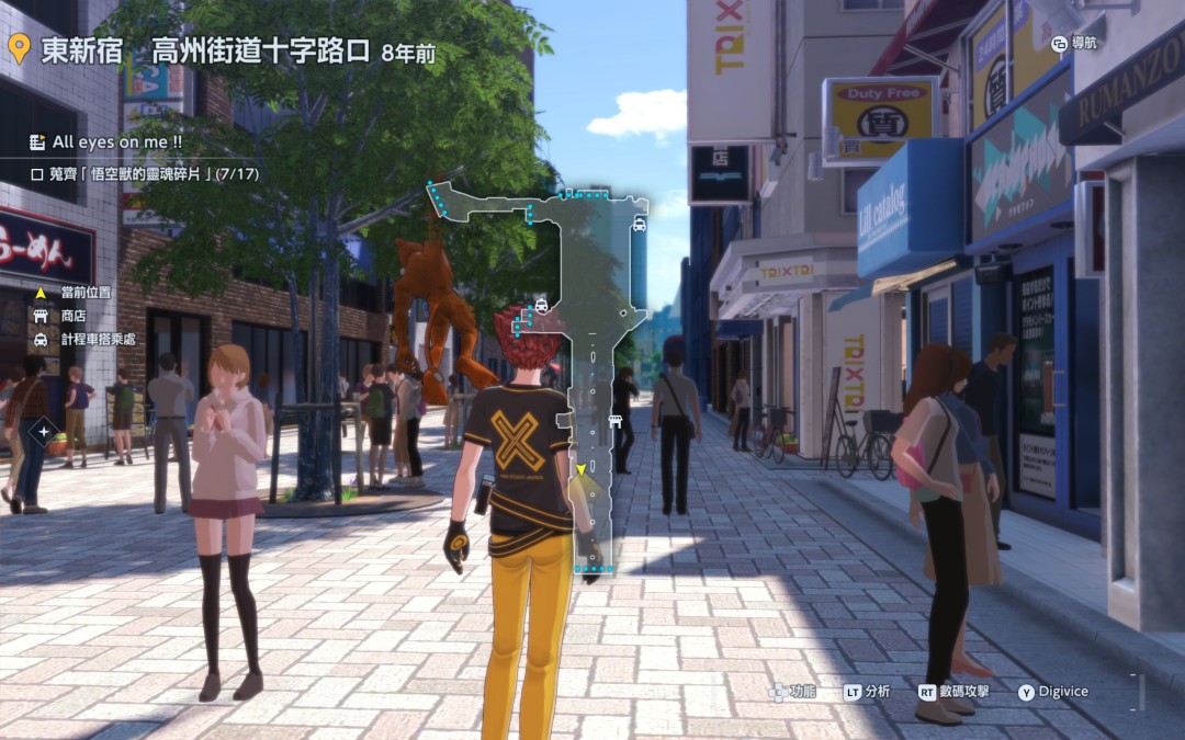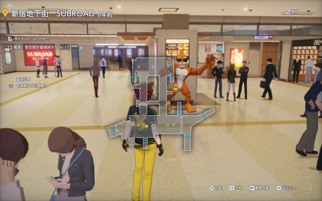 《数码宝贝:时空异客》里面有很多的任务可以完成,All eyes on me就是其中的一个支线任务,如果想要完成这个任务一共有17个碎片需要收集,有三个分别在电视台广场,高州街道十字路口跟新宿地下街。