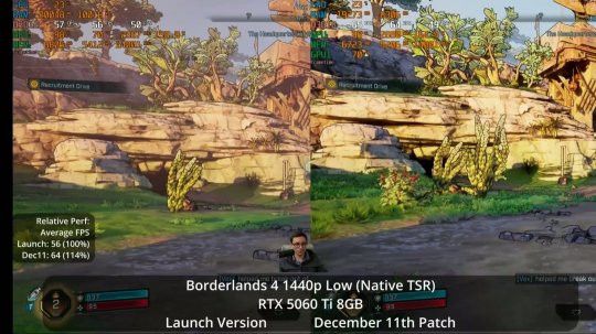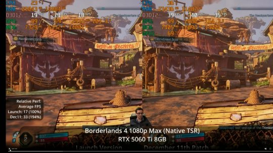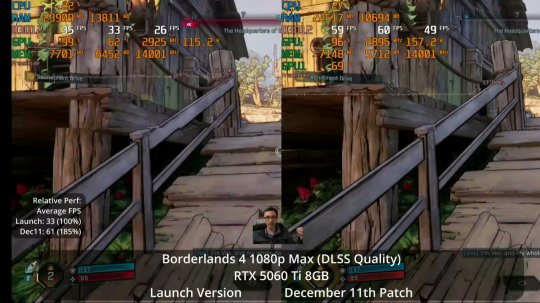 油管频道Daniel Owen测试了此次更新。在配备8GB显存的显卡上,性能提升非常显著。得益于此次更新,现在即使是像RTX 5060Ti 8GB这样的显卡,也能在高画质设置下以更高的帧数运行《无主之地4》。在最高画质设置下,性能几乎可以翻倍。