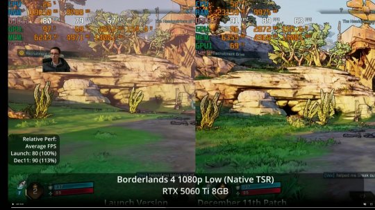 1080P,低画质,原生TSR,首发版 vs 12.11补丁后帧数对比(80 vs 90),提升13%