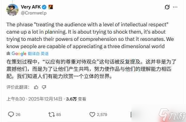 在社交平台上,拉瑞安工作室发型总监Michael Douse就预告中浓重的暗色基调作出回应。他透露,在构思《神界》的首次曝光策略时,“以恰如其分的敬意面对观众”始终是核心原则。“我们不是为了哗众取宠,而是希望内容能契合观众的理解深度,进而激发真实的情感共振。我们深信,玩家完全有能力沉浸于一个层次丰富、不加简化的世界。”