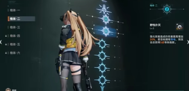 如果是蚀刻或者电导属性的范围伤害则倍率增加到百分之六十,若目标是大型单位则伤害翻倍,每次给敌方施加导电增益时莱娜都能获取一点导染,除了普攻之外每次释放技能时如果持有的导染大于或者等于三,莱娜会自动消耗三点导染对该技能进行强化。莱娜的主力输出技能是野性扑灭,强化后能获得百分之三十伤害提升,跃动追踪强化后能增加三格额外移动,配合原有的七格行动,十格的超长位移能让莱娜轻松飞跃各种障碍,还能触发琼玖等人的支援攻击。使用导染强化后能获得指令追加,当莱娜拥有三点导染时可以先用跃动追踪抵达优势位置,再使用野性扑灭或者狩猎策略进行输出控场。