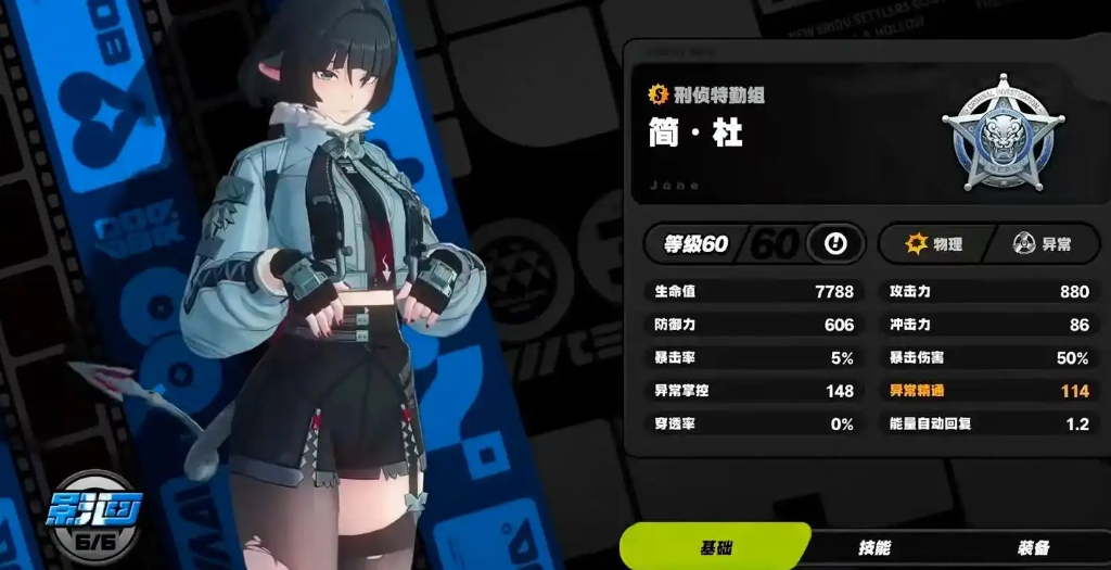 简的核心技洞察是被自身命中的敌人会进入持续十秒钟的啮咬状态,只要敌人处于该状态队伍中任意角色触发的强击伤害都有百分之四十的概率让原来无法暴击的强击,触发一点五倍暴击,而且简的每点异常精通都会使暴击率额外提升一定百分比。当简的异常精通值大于三百七十五后,强击就百分之百触发一点五倍暴击。搭配额外能力痛点在队伍中有异常或者和简同阵容的角色时,比如说队伍中带个赛斯,简异常积蓄效率就会提升百分之二十。