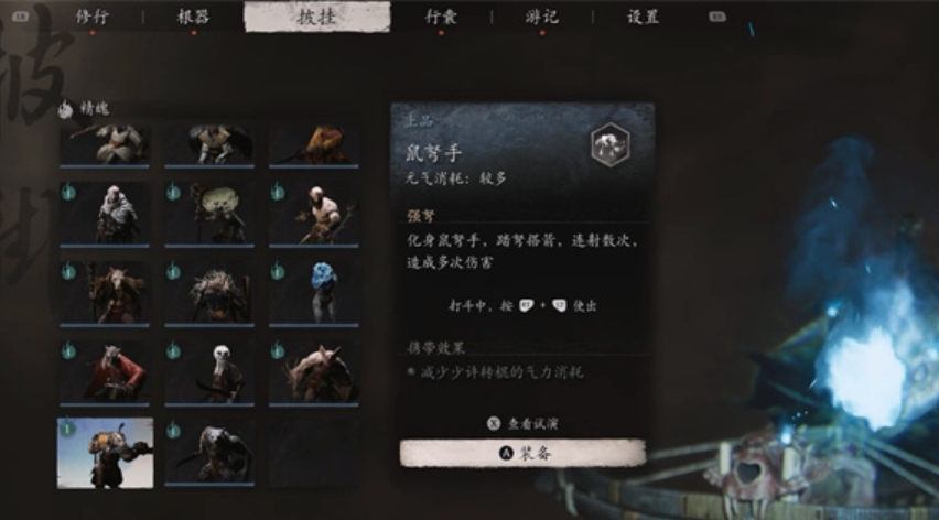 鼠弩手的携带效果是能减少转棍的气力消耗,直立的棍花能多转一个来回,提升不算很多。鼠弩手的炼精升级前两次都是减少该精魄的元气使用量,需要花费四千五灵蕴和一个铁中血。再花费六千灵蕴加两个铁中血升级到四级后,鼠弩手射出的弩箭从五支提升到了八支,此时可以通过及时切换攻击目标的操作让两个敌人同时陷入燃烧状态。