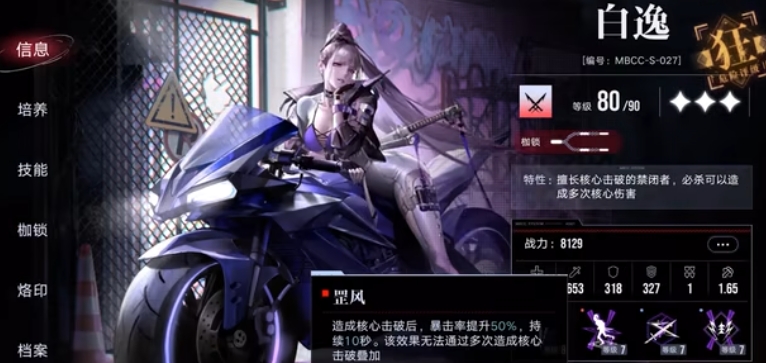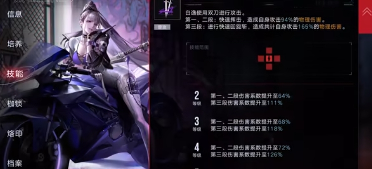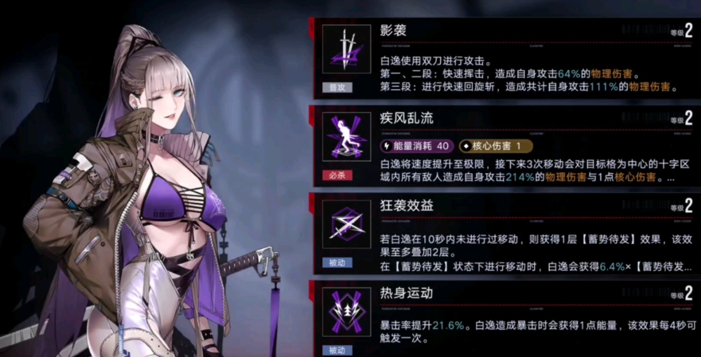 必杀是白逸接下来三次移动会对十字范围的敌人造成伤害并附加一点核心伤害,而且每次移动获得百分之十几暴击率提升,该效果能叠加,通谈必杀一共能获得百分之一百五的暴击率提升,必杀是白逸的核心技能,不管是破核还是打输出必杀的使用决定了白逸的上限,提升必杀等级仅提高移动造成的伤害,对于整体输出提升不大。被动一狂袭效益是白逸十秒钟之内没有进行移动能获得一层蓄势待发效果,这个效果能叠两层,在这个状态下进行移动白逸能获得一定攻击提升。
