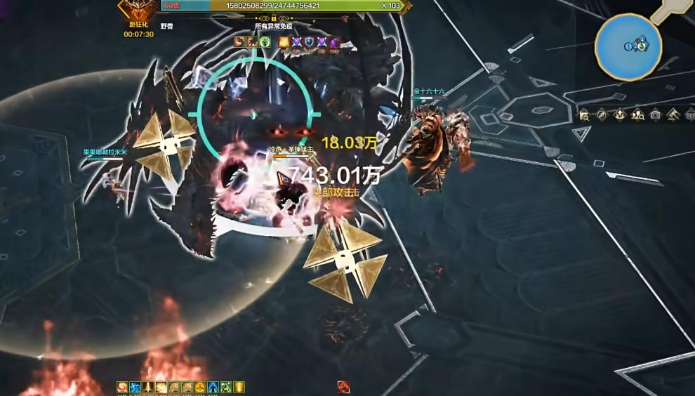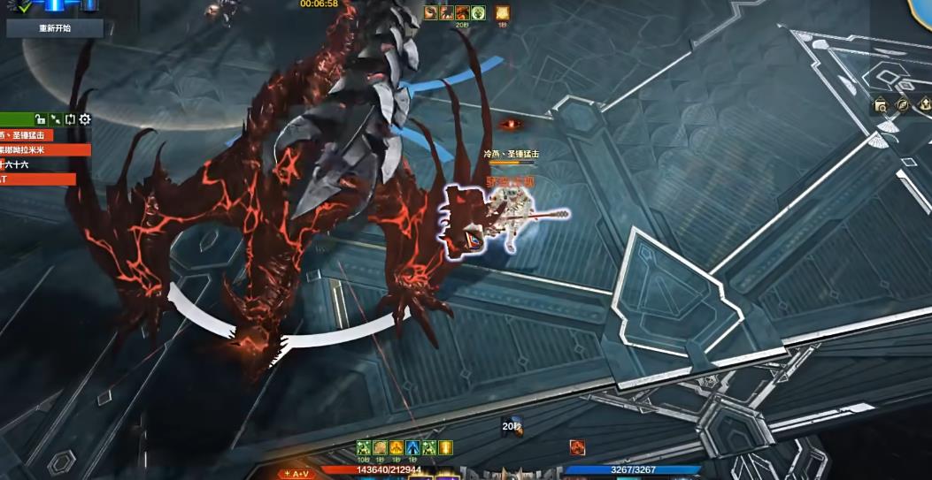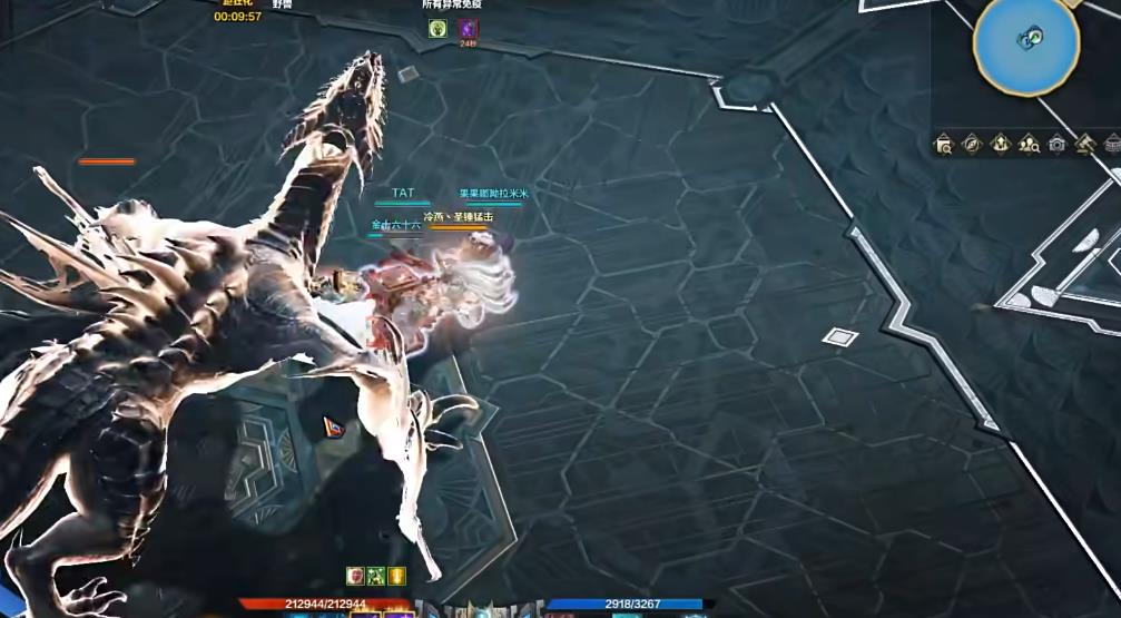 触发成功后会出现第一次瘫痪条,打瘫失败后会解除束缚,一段时间后还会出现第二次打瘫。打完后就会出现第三次,第三次是无法打瘫的,也就是boss会强制解开束缚,接着便会进行拍地攻击并喷火攻击。当其剩余九十五管血左右时便会回到地图中间,在一、六与十一等三个点位都会出现三个分身。辅助玩家需要留在中间,其他三人迅速远离中间区域来到点位去攻击分身。
