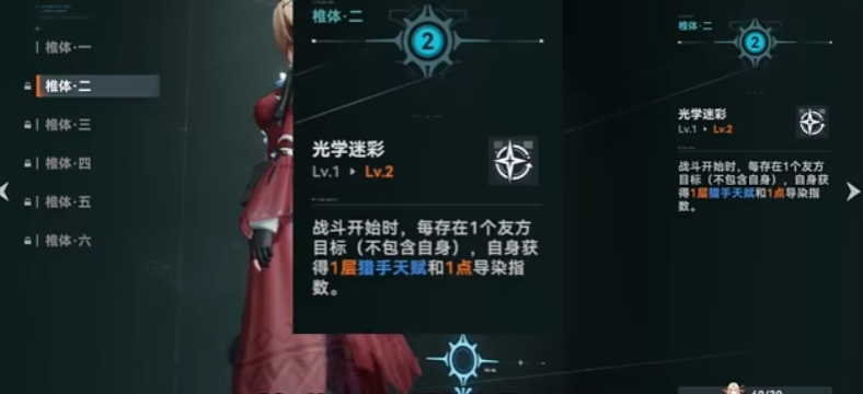 有了二椎后开局就能直接突入后排并获得迷彩,开局手感大幅提升,三椎能让二技能标记的敌人很难逃离,增加第二段和第三段伤害的命中率,受伤降低能用在对付近战敌方单位或者BOSS战时保障生存,不过受伤减少也有可能导致迷彩无法触发。四椎是增强四技能的机动性和灵活性,增加射程后能更加自由的选择起跳点,增伤上限的提升不仅拔高了斩杀线,还能让四技能的释放时机变得更加宽松。五椎攻击前移动两格的条件几乎等于无条件,攻击力提升百分之二十主要是数值提升,同时还降低了被动迷彩的触发阈值和冷却时间,生存能力也得到了显著提升。