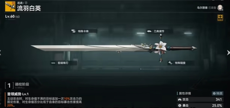 乌尔丽德武器首选流羽白英,这把武器从爆伤、固伤和导染三方面强化了乌尔丽德的进攻性能,攻击生命值在百分之八十以下的敌人时能获得一点导染,如果每回合都能触发就相当于导染回复翻倍,可以大幅度加快三技能回转。对生命值低于自己的目标增加暴伤触发也比较简单,而且乌尔丽德能轻松满暴,暴伤收益稳定,对生命值不满的敌人施加的固定伤害除了能提升输出总量还能克制锁血的敌人。该武器的属性是暴击率,能把固键理想化状态的位置释放出来,间接提升了乌尔丽德的伤害上限。