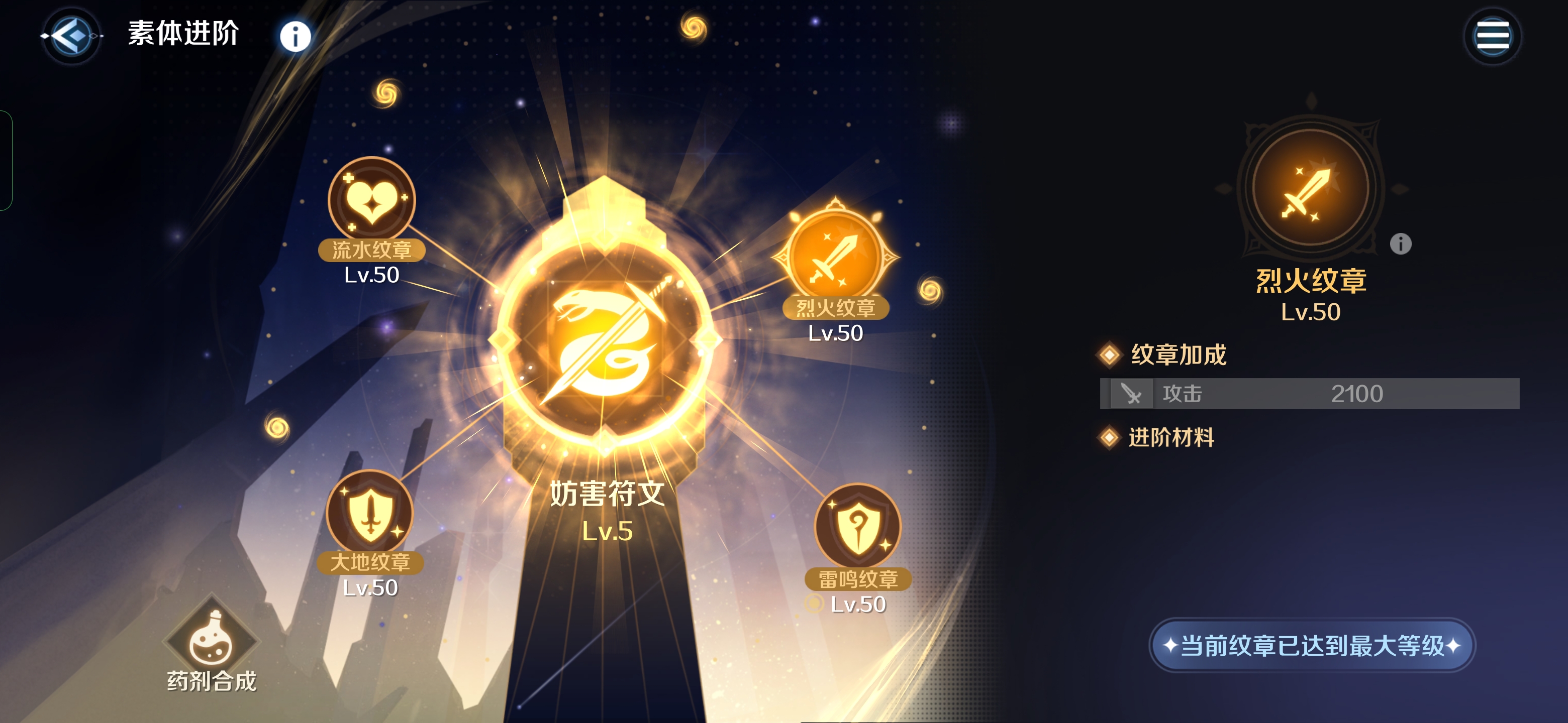 5阶的妨害素体烈火纹章提供2100点基础攻击力加成,同时纹章加成提供100%,也就是2100*(1+100%)=4200,对比魔导可以看出妨害的素体提升的属性相对而言没有那么高。