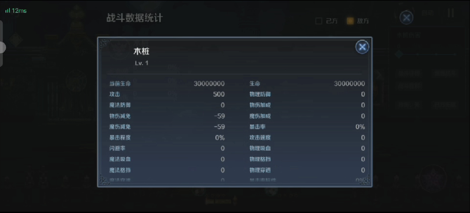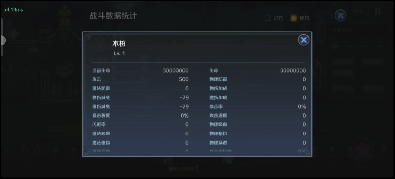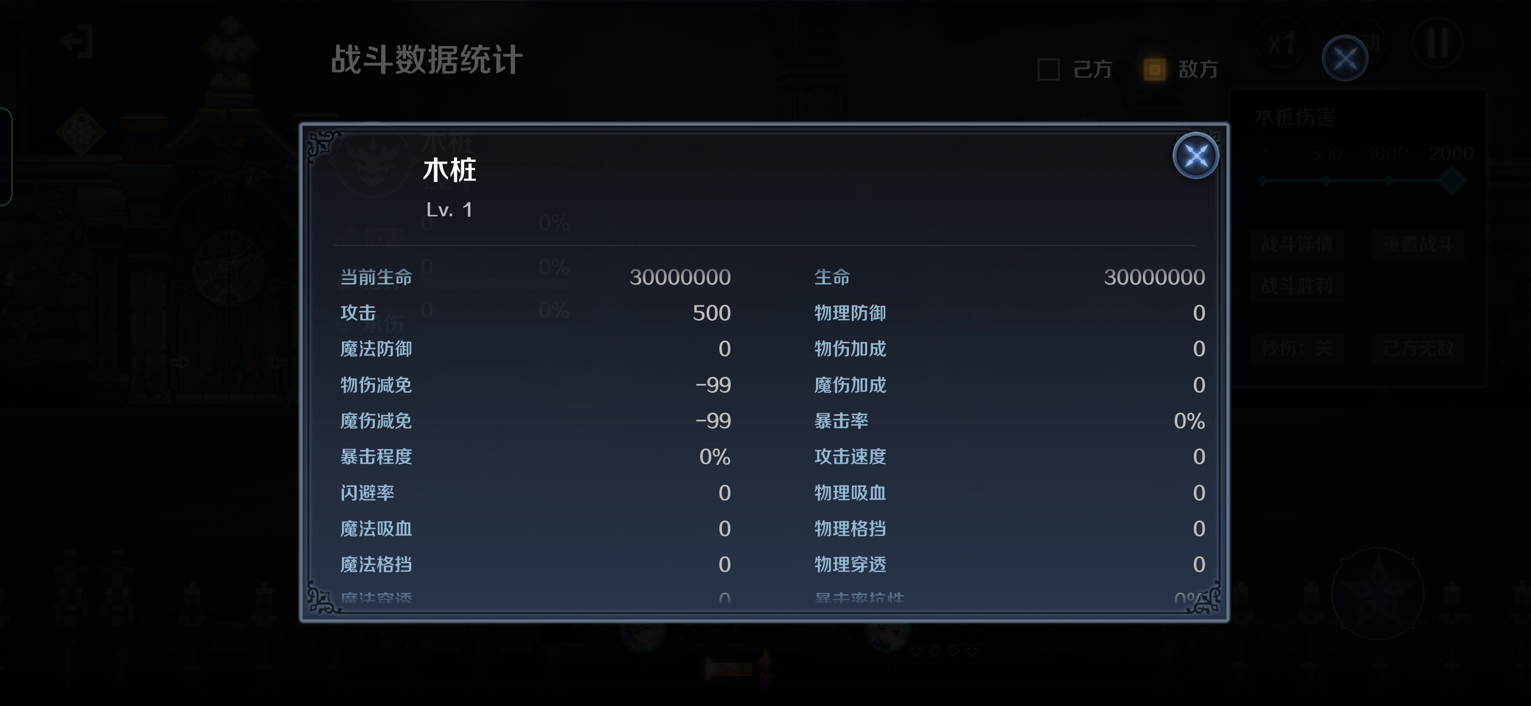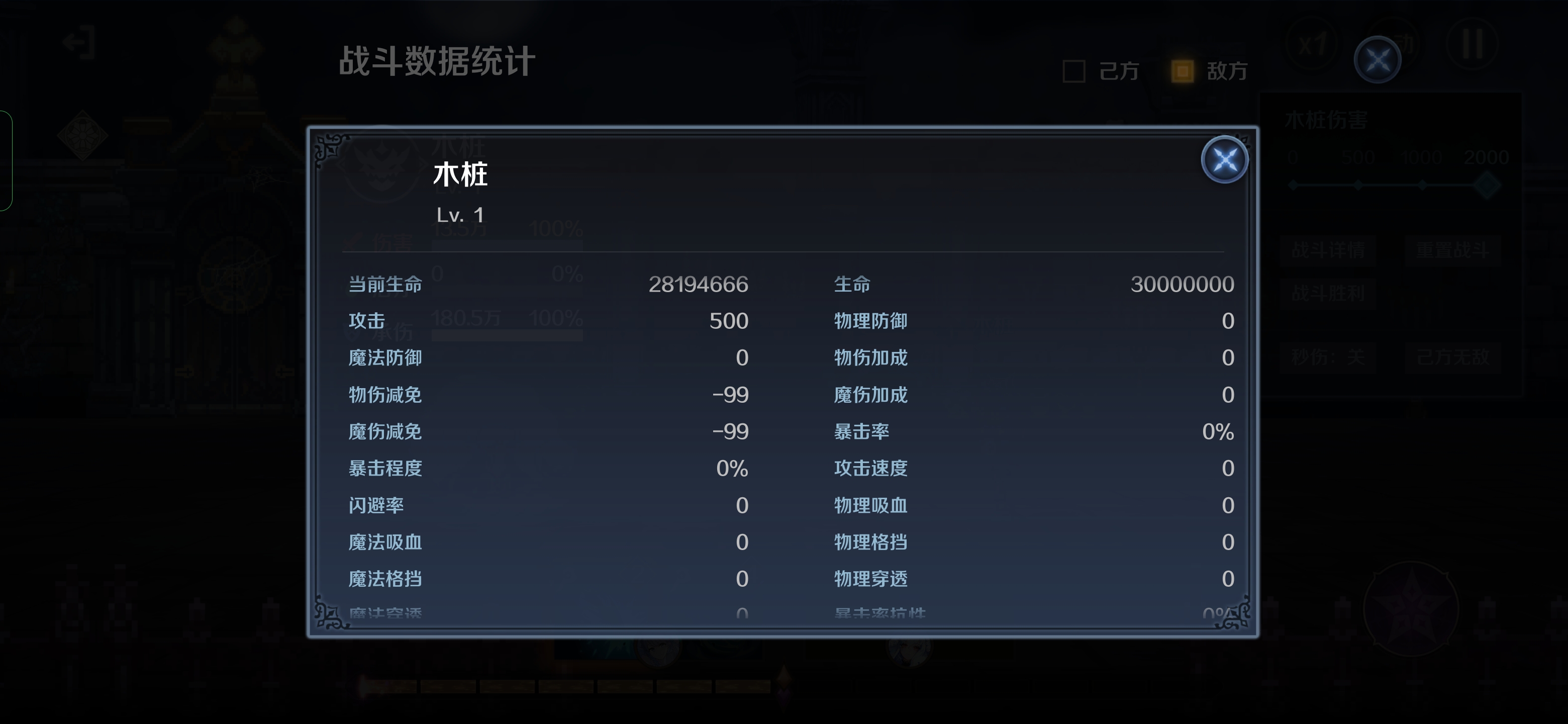此时稻草人数据显示物伤、魔伤减免为-99,符文效果依旧生效。