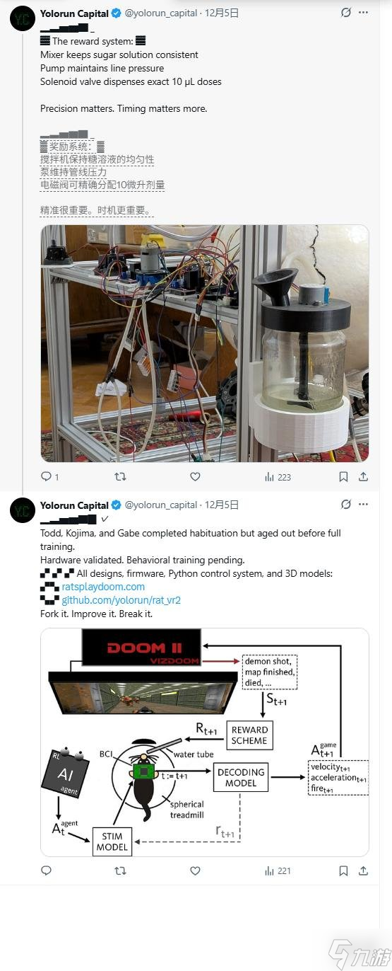 项目的核心逻辑充满了行为心理学的味道:为了在游戏中痛击恶魔,这套装置被设计得极其精妙。它包含一个追踪老鼠运动轨迹的聚苯乙烯球体跑步机、环绕视角的AMOLED全景屏幕,以及一个需要老鼠用前爪触发的射击传感器。而在驱动这群“鼠辈战士”去战斗的动力,并非拯救地球的使命感,而是在做出正确操作后系统自动供给的快乐水——糖水奖励。