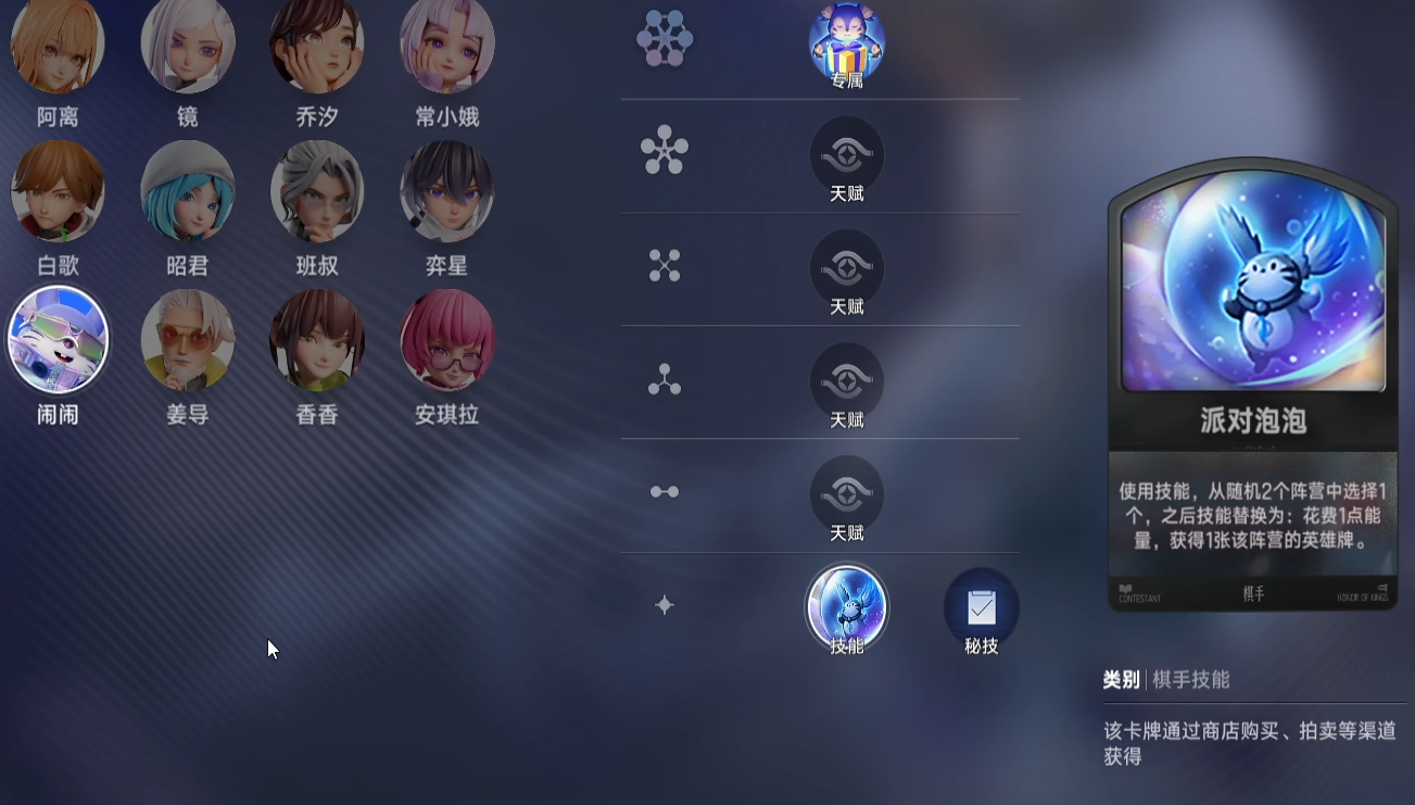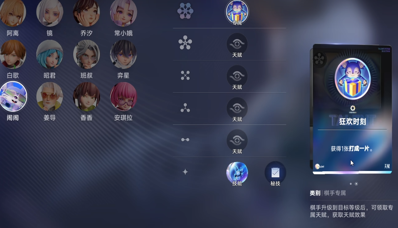 作为典型的阵营引导型策略棋手,闹闹的核心价值在于资源调度与团队增益赋能。其双秘技【欢乐集结】与【狂欢时刻】共同构筑起可持续运转的运营闭环:【欢乐集结】需场上已部署6名指定阵营英雄方可激活,生效后立即获得秘技牌“朋友多多”,一次性抽取5张同阵营英雄卡,显著缩短核心英雄升星周期,强化中期战力成型效率;【狂欢时刻】则需棋手达到对应等级后解锁,激活后不仅提供基础属性加成,还可开启天赋三选一分支系统,进一步拓展战术适配维度。