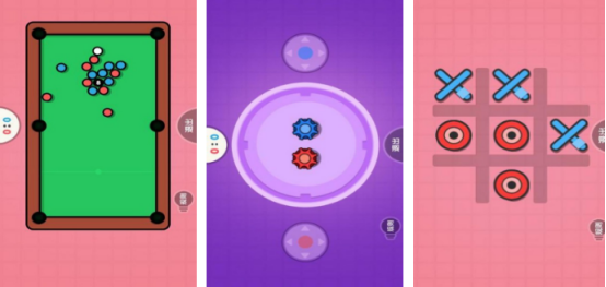 整合多款轻量级双人小游戏,包括井字棋、台球等经典玩法。台球模式中,界面呈现高饱和度彩球与主球,玩家通过滑动瞄准、点击击球完成出杆操作,系统实时计算角度与力度,影响进球得分;顶部常驻双方比分栏,便于实时比拼进度。