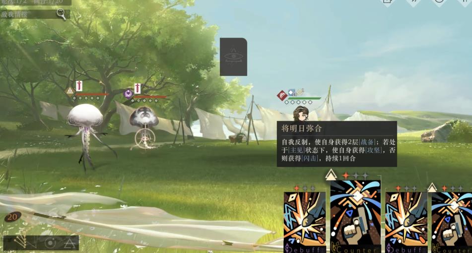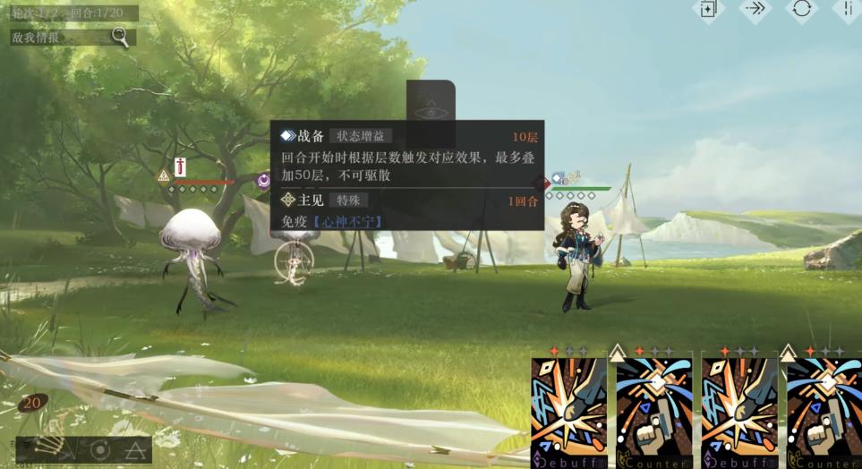 莫莉德尔在第一回合开始的时候头上已经有两个buff,左边层数为十的重叠正方形名为战备。其本身没有任何效果,只是个单纯用来计数的标识,当其叠到特定层数时便会获得对应效果。而莫莉德尔能通过叠加战备,在回合开始的时候获取主见、战备部署、武装整修等增益。其中主见是四叶菱形的图标,通常会在战备层数大于等于10层时获得,因为莫莉进场就给10层战备,所以我们在第一回合就能拿到主见。