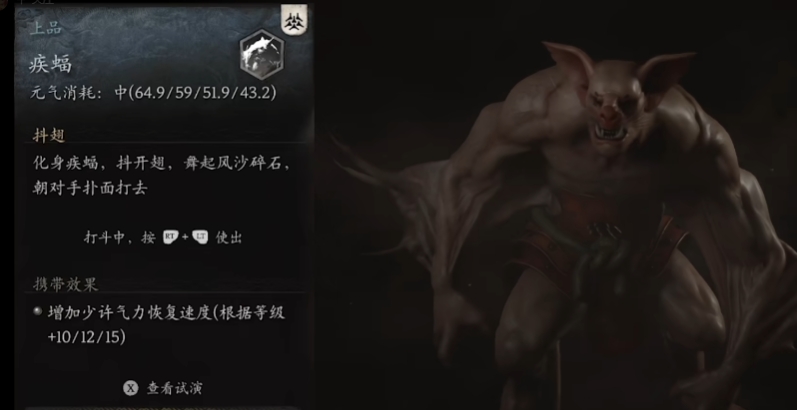 不锁定敌人的情况下也能在变身的瞬间临时改变方向,携带疾蝠的效果主要是增加少许气力回复速度,在等级为一级、四级和六级时能分别提供十点、十二点和十五点的回复速度。携带了疾蝠后的气力条能让多转棍半秒的时间,满级后元气条比较短,通常能用在上前连续输出一波体力降低后,使用疾蝠作为后撤手段等待气力回复。