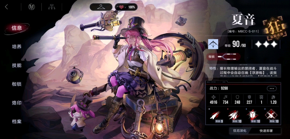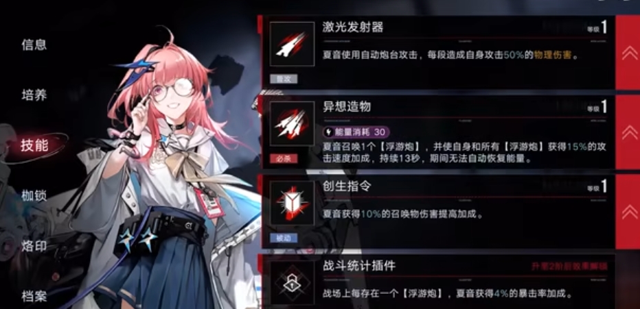普攻带来的收益并不高,升满后攻击力倍率只有百分之九十一,综合输出本体不如浮游炮。开启必杀后会召唤一个浮游炮,自身和浮游炮的攻速增加,不过一级只有百分之十几的攻速加成,被动一是增加浮游炮的伤害,被动二时激活浮游炮后提供暴击几率。对夏音提升较大的枷锁是二伽三枷和五伽,能让夏音在长线作战关卡中有着更高的上限,高枷和零枷的夏音差距还是比较大的。目前最适合她的烙印是造物,百分之二十五的召唤物伤害提升收益极大,她的被动创生指令升满才百分之十八的加成,但造物提供的属性是生命值。