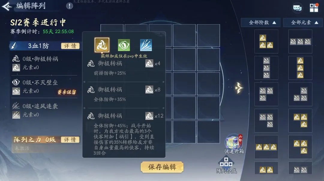 赛季保存盘,12星能力为全体防御+45%,战斗开始时,为我方攻击最高的3个侠客附加【祸引】,受到直接伤害的35%转移给友方非自身血量最高的侠客,持续3回合。