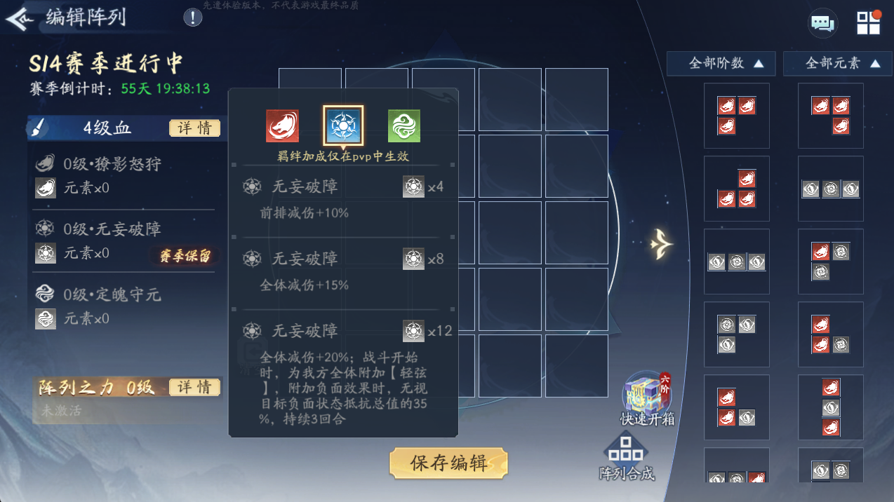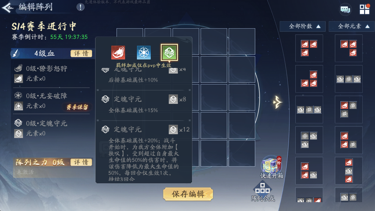 本赛季S14归墟盘的三种元素为:獠影怒狩(暴伤+回怒)、无妄破障(减伤+无视负面状态抵抗/赛季保留)、定魄守元(全属性+伤害降低)