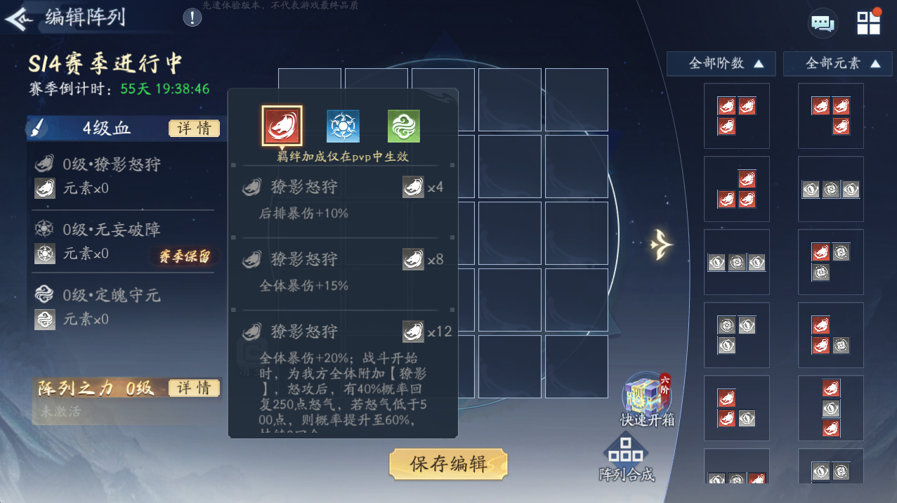 獠影怒狩(暴伤+回怒): 全体暴伤 + 20%;战斗开始时,为我方全体附加【獠影】,怒攻后,有 40% 概率回复 250 点怒气,若怒气低于 500 点,则概率提升至 60%,持续 3 回合