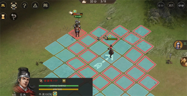 第三回合下方步兵继续贴近敌人弓兵进行攻击,骑兵开技能斩杀掉敌人一个步兵,弓兵移动一步如图攻击敌人骑兵,弓兵继续保持和敌方骑兵的距离。