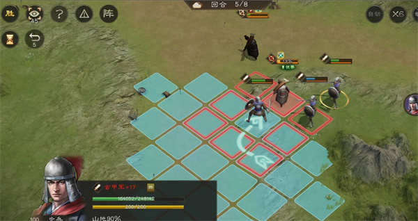 第四回合敌方步兵被我方消灭后,右侧我方骑兵、步兵向下移动攻击敌人弓兵,下方步兵继续追击敌方弓兵并贴近攻击(贴近攻击不会被反击)。