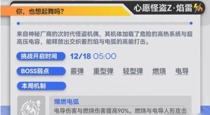 首先是心愿怪盗Z·熔岩,他来自神秘厂商,是次时代怪盗机偶,胸膛中燃烧着不屈的烈焰,该BOSS的弱点有霰弹,重型弹,中型弹,燃烧,本关的机制,燃烧伤害提高90%,造成燃烧伤害时,暴击伤害提升60%。