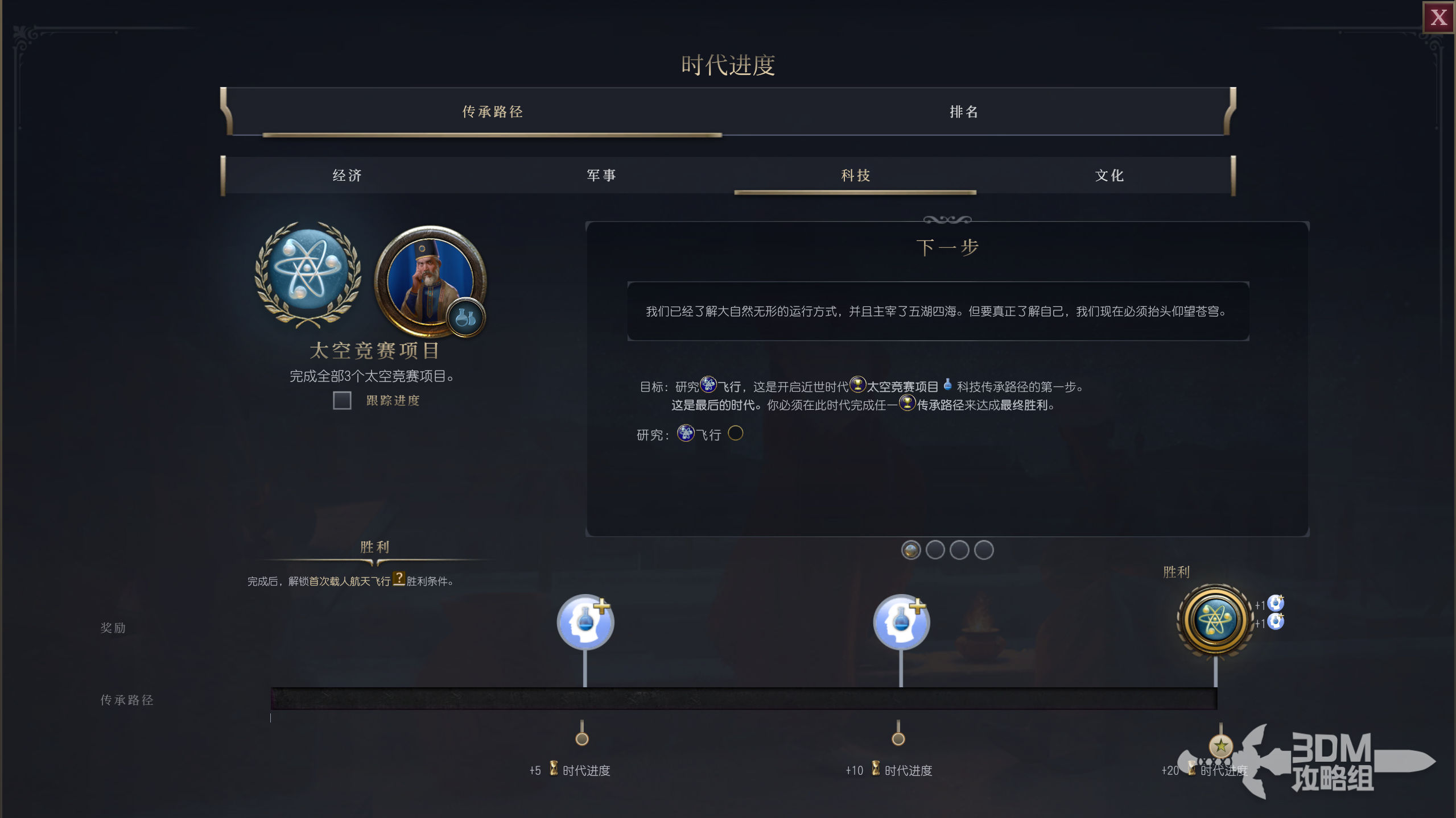 近世时代目标:研究飞行,这是开启近世时代太空竞赛项目科技传承路径的第一步。这是最后的时代。你必须在此时代完成任一传承路径来达成最终胜利。