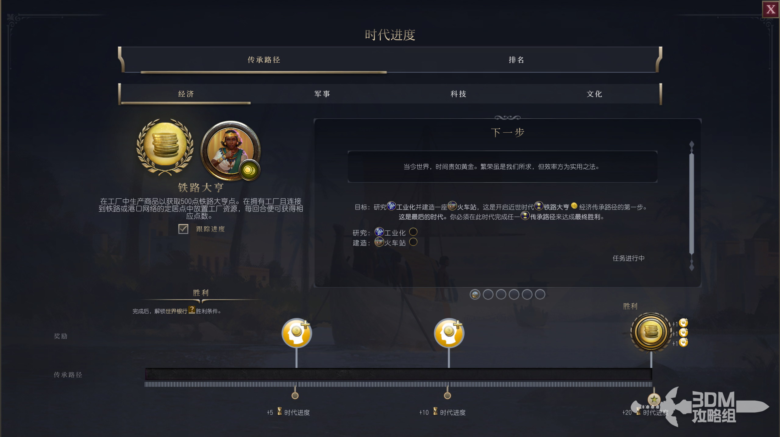 近世时代目标:研究工业化并建造一座火车站,这是开启近世时代铁路大亨经济传承路径的第一步。这是最后的时代。你必须在此时代完成任一传承路径来达成最终胜利。
