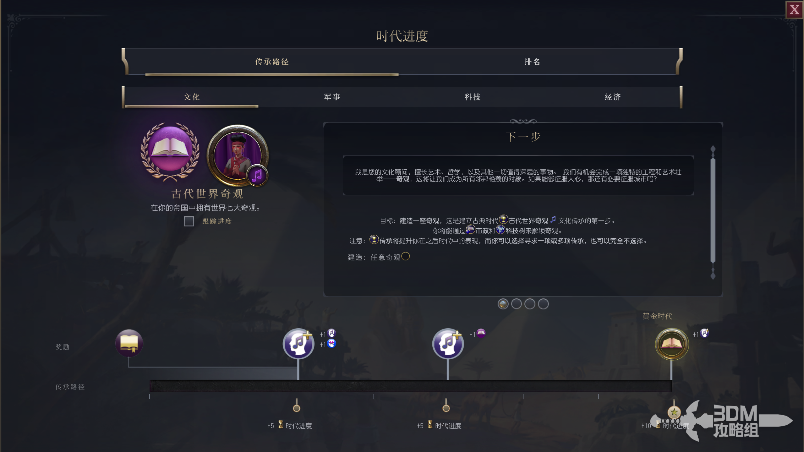 探索时代目标:建造一座奇观,这是建立古典时代古代世界奇观文化传承的第一步。你将能通过市政和科技树来解锁奇观。