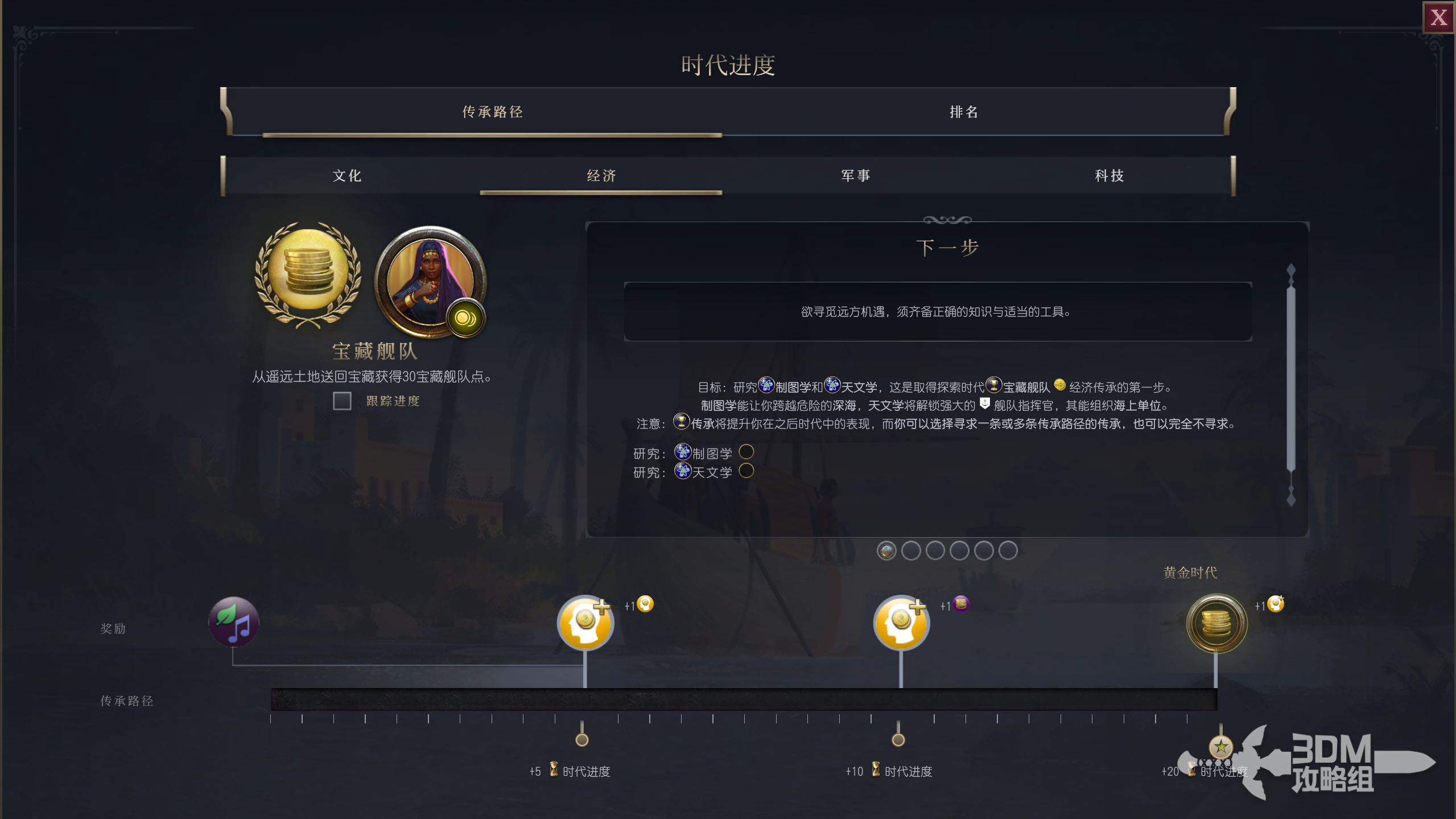 探索时代目标:研究制图学和天文学,这是取得探索时代宝藏舰队经济传承的第一步。制图学能让你跨越危险的深海,天文学将解锁强大的舰队指挥官,其能组织海上单位。