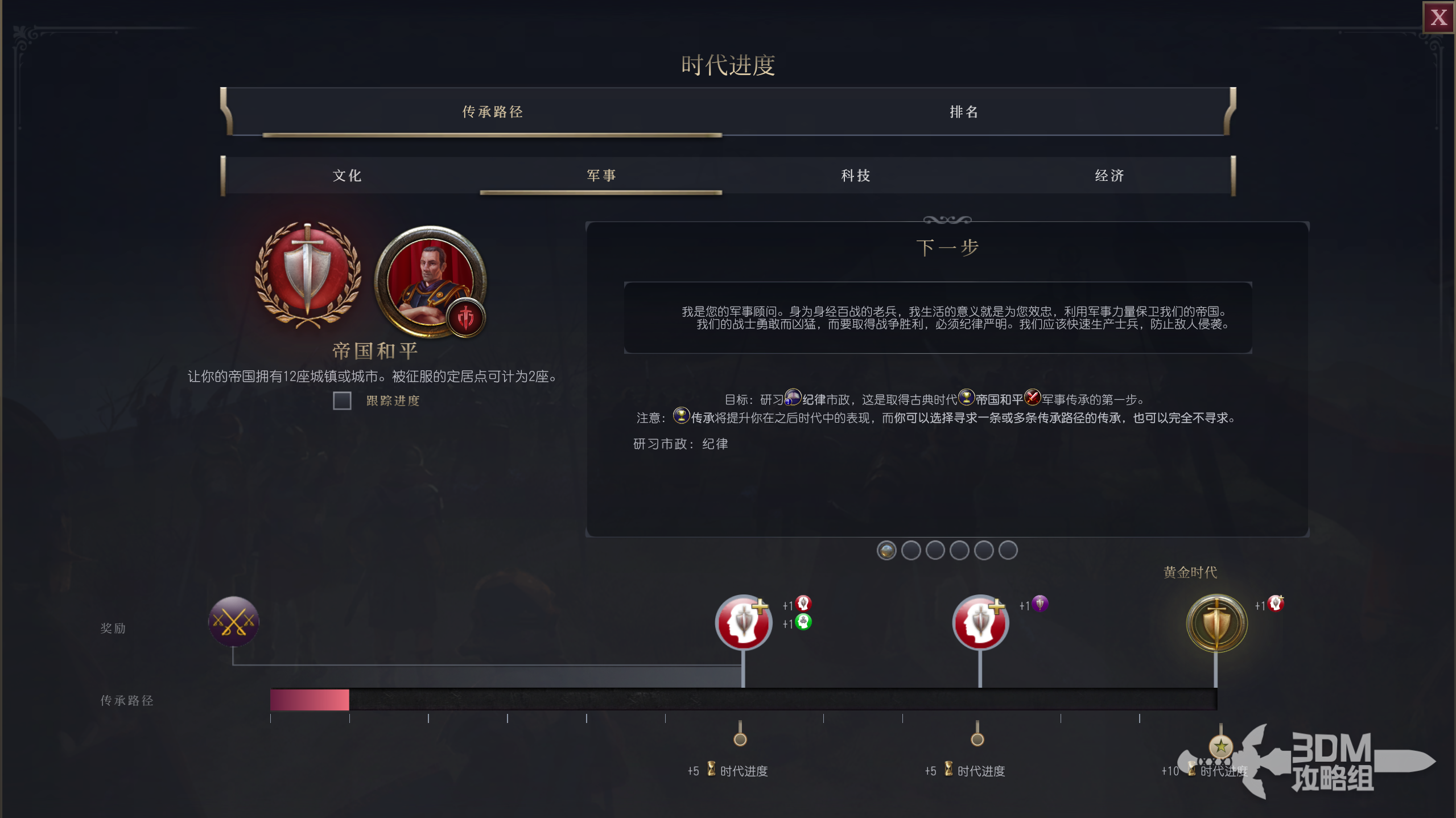 古典时代目标:研习纪律市政,这是取得古典时代帝国和平军事传承的第一步。