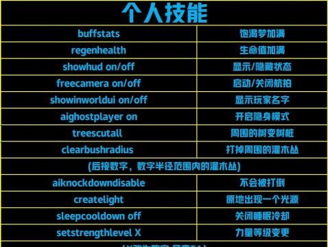 资源管理是生存的根基,loghackon可以开启木材无限模式,降低建造压力,loghackoff可以随时关闭该功能,回归到采集原味。想要快速获得物资的话addallitems可一键添加所有物品于背包中,反之removeallitems会清空所有物品。