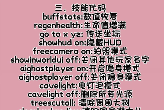 生存能力增强类代码提升了角色的适应性,输入godmode on即可进入无敌状态,不受任何伤害影响,godmode off关闭后恢复正常。superjump on和speedyrun on分别给予超凡的跳跃与奔跑能力,使地图探索变得如同踏平草地般轻松,黑暗洞穴也不再令人恐惧,cavelighton可以点亮环境,cavelight off则恢复原状。