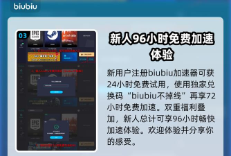biubiu对于新玩家的诚意,在丰厚福利中展现得淋漓尽致,首次注册用户即可收获流畅网络守护24小时的好礼,而更加令人振奋的是,新用户只要在biubiu官方活动页面输入专属口令【biubiu不掉线】,就能立刻投身到紧张刺激战斗72小时当中去,这也就意味着新用户可以享受到长达96个小时的免费加速待遇。