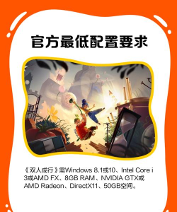 这游戏必须两个人合作才能玩。为了解除诅咒、变回人样并修复关系,得一起闯过七个主题和玩法完全不同的关卡,比如工具箱王国、雪景球、花园等等,每个场景的想象力都特别丰富。下面来看看双人成行配置要求是什么?家里的设备能不能迈过这个门槛,了解清楚我们就能痛快联机了,这就给大家带来相关介绍。
