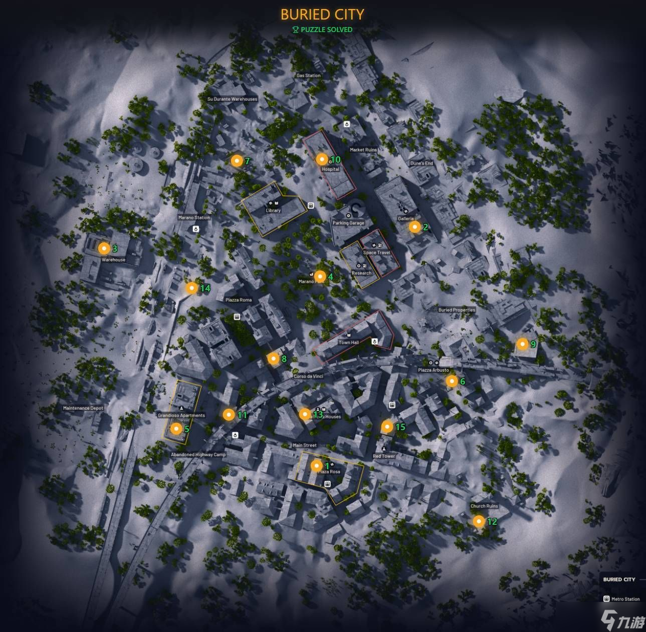 许多人认为这是游戏目前最难的谜题,如果你最近去过被掩埋的城市,可能已经瞥见了谜题的一部分。现在地图上散布着15个按钮,每个按钮对应一个音符。这是因为还有一扇锁着的门,关键在于需要按照特定顺序按下所有按钮——顺序由与门在同一栋建筑里的音符涂鸦指示——才能解锁它。