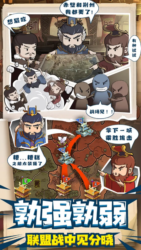 创新融合兵种协同与权谋叙事系统。武将按骑兵、弓兵、步兵、器械四大兵种划分,存在克制关系与阵型加成,同一阵容可配置主将+副将+策士三层指挥结构。主线剧情嵌入东汉末年政治生态演变,玩家抉择影响势力声望、人才投奔倾向与资源产出效率。战斗采用六宫格战场模型,技能范围、移动距离、地形障碍均参与运算,需提前规划走位路径与集火顺序,确保关键目标被有效压制或保护。