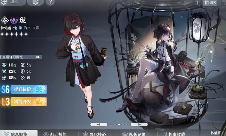 珑是稀有度为六星的蚀元素菱形职业,能够根据普攻的次数来持续恢复队友的血量。还具备有急救、异核充能等回复效果,对于不同元素队长拥有不同的增益。例如队长为蚀元素时即可提高暴击与攻速,是其他元素的话则会提升攻击并无视基础减伤。与芙蕖相比较没有专精增益,但是多了伤害控制与攻击带来的额外蚀爆,开花后的额外暴击增益、全元素减抗属性加成较高。